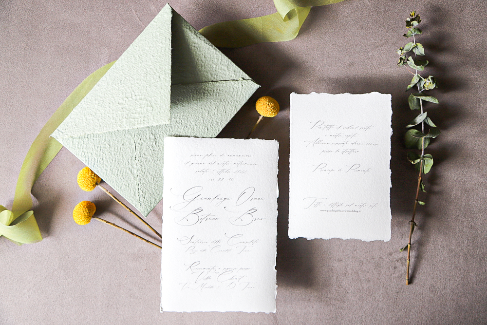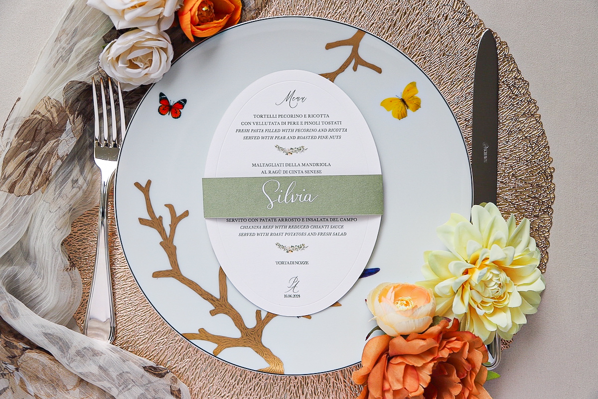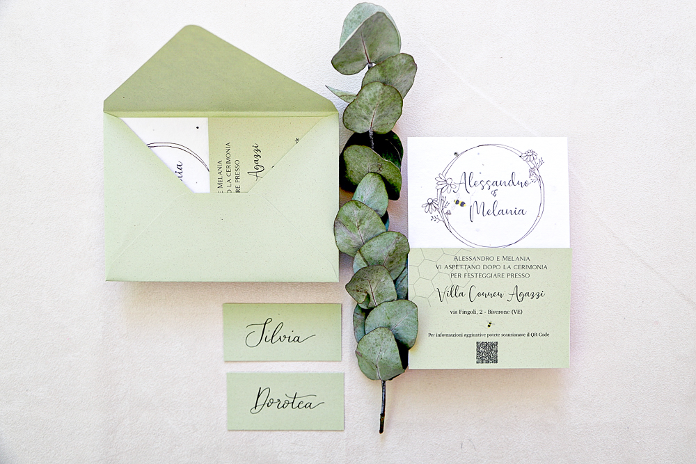 Immaginate di aprire la busta del vostro invito e di trovare una composizione armoniosa di verdi sfumati, dettagli botanici delicatamente acquerellati, un tocco di oro o rame per un effetto sofisticato. L’invito è solo il primo assaggio di ciò che gli ospiti vivranno nel vostro giorno speciale.